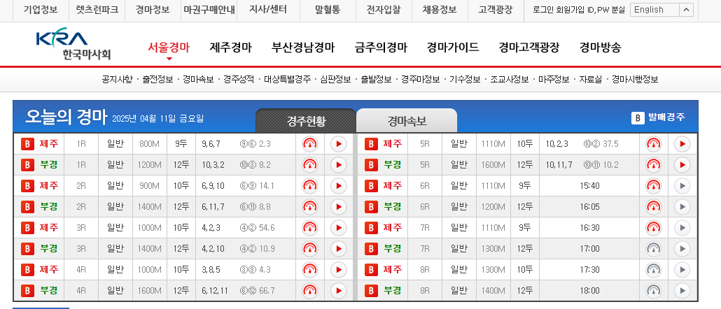 - 배당률 정보: 단승, 복승, 삼복, 삼쌍 등 모든 유형의 배당 정보 제공