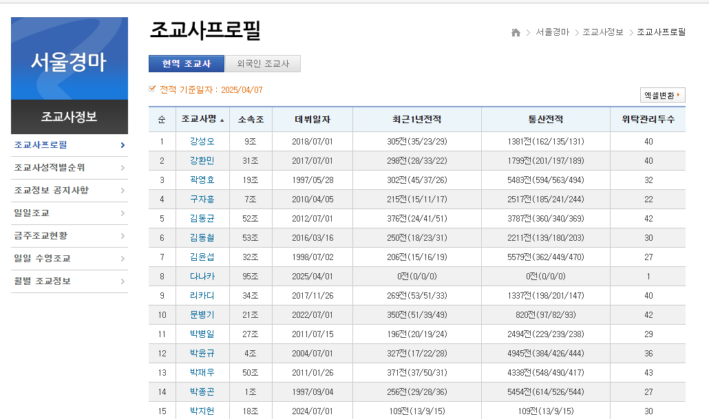 - 조교사의 마필 관리 능력 및 최근 성적 확인 가능