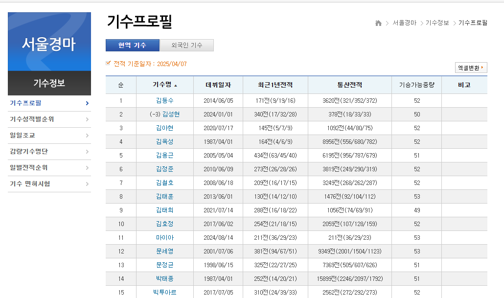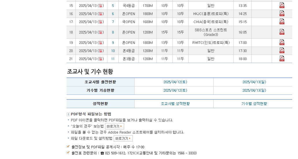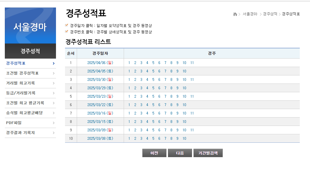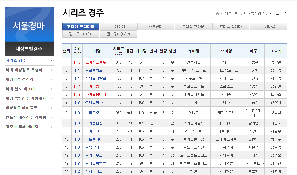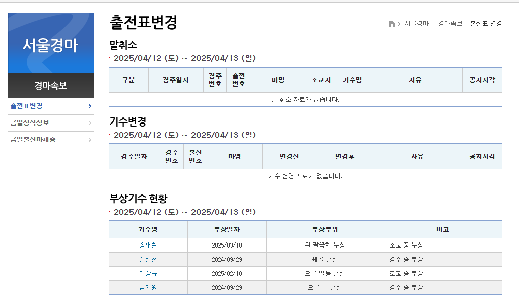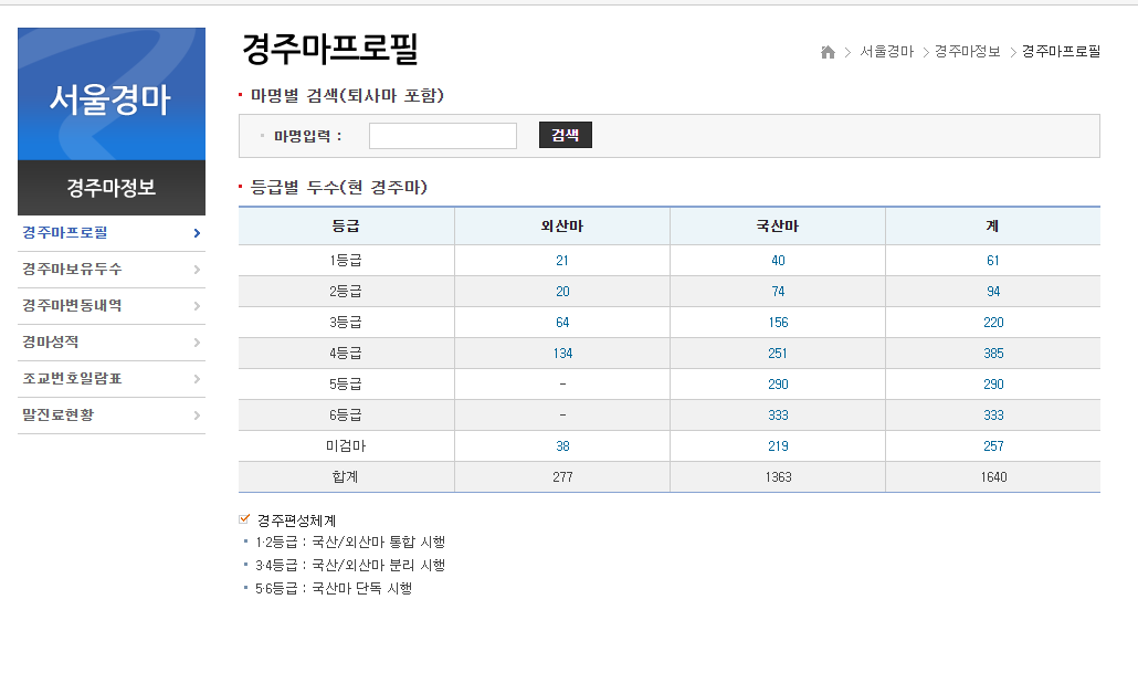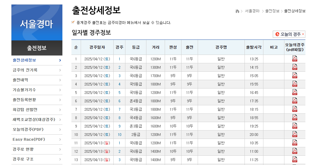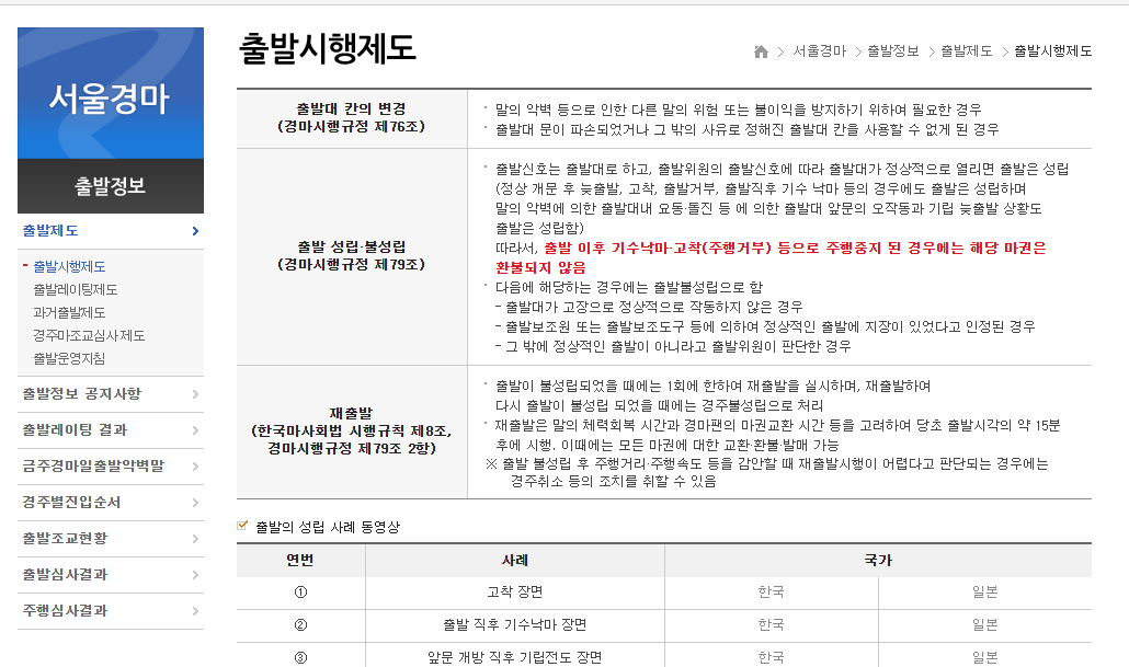 - 출전마 명단: 경주에 출전하는 모든 말의 이름, 나이, 성별 등 기본 정보