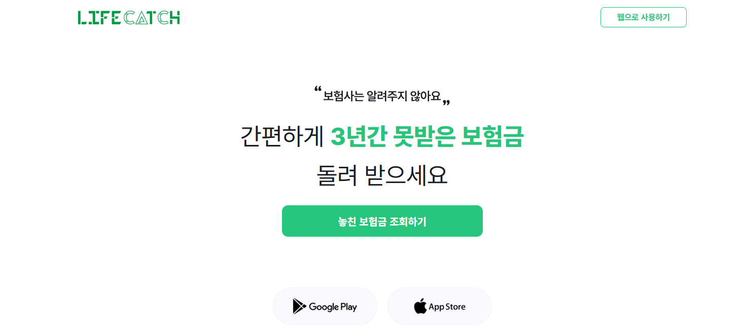 라이프캐치는 그린리본에서 운영하는 놓친(미청구) 보험금 조회 및 청구 대행 서비스입니다. 누적 가입자 120만 명이 이용하고 있으며, 평균 264,690원의 환급금을 신청하고 있는 것으로 나타났습니다. 홈택스와 신용정보원에서 연동해온 데이터를 종합 분석하여 사용자가 놓친 보험금을 정확하게 찾아주는 것이 주요 특징입니다.