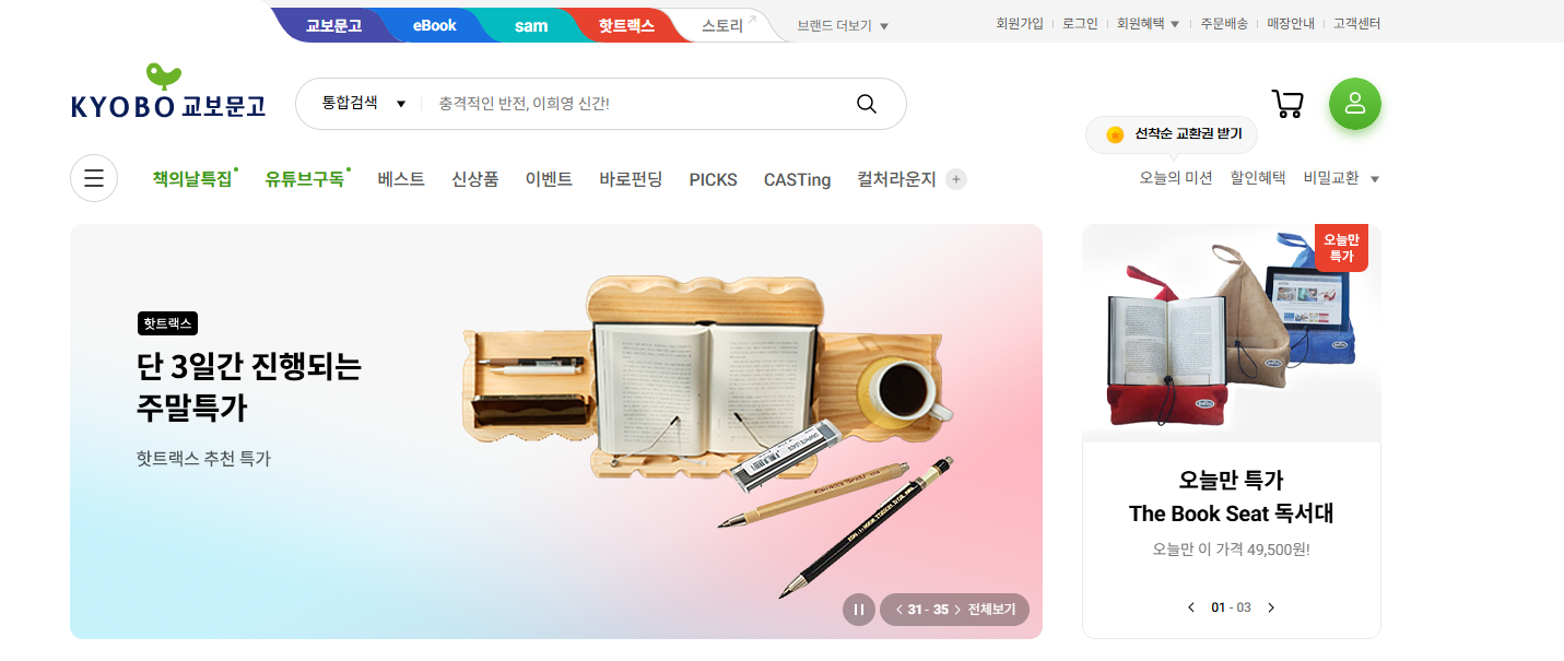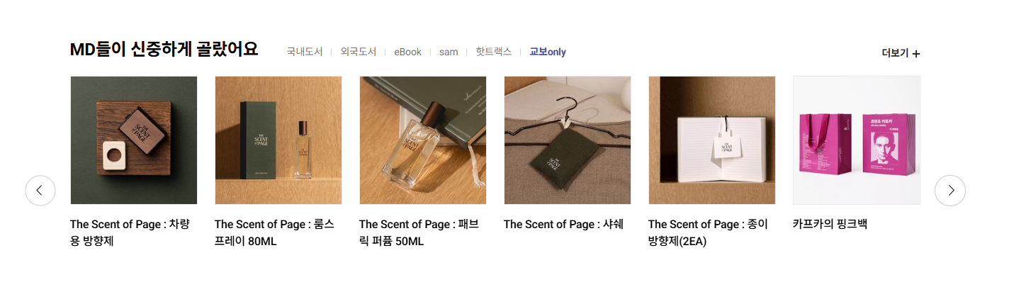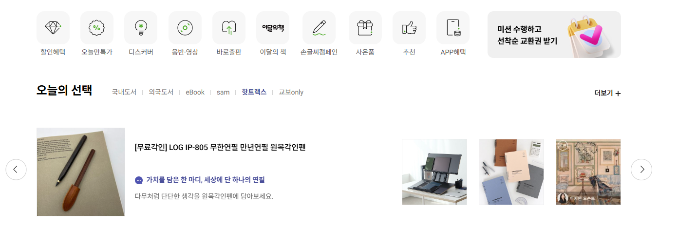 도서뿐만 아니라 전자책, 오디오북, 외국도서, 문구, 기프트 상품, 문화공연 티켓까지 다양한 상품군을 한눈에 보고 구매할 수 있어 많은 이들에게 사랑받고 있습니다.