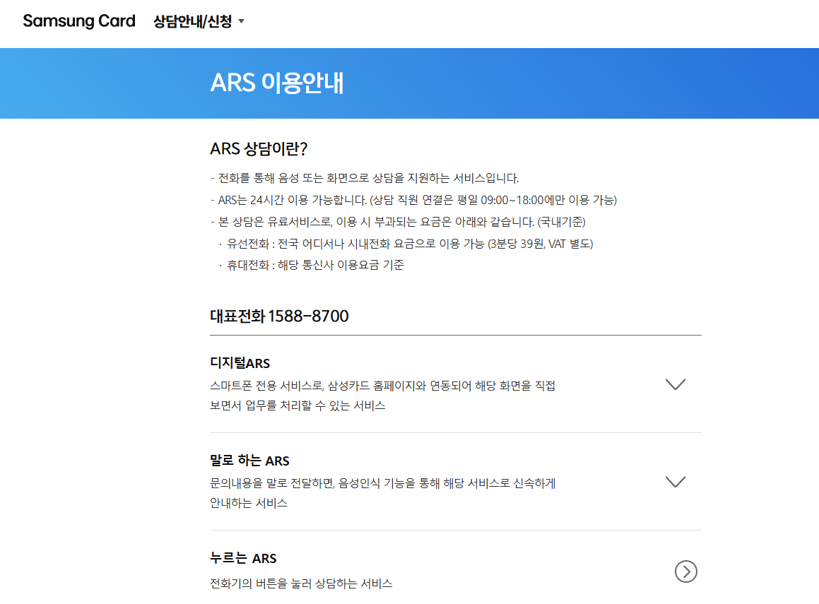 삼성카드는 고객 편의를 위해 디지털 ARS, 말로 하는 ARS 시스템을 운영 중입니다. 복잡한 숫자 선택 없이 간단한 조작이나 말 한마디로 원하는 서비스에 도달할 수 있는 시스템입니다.
