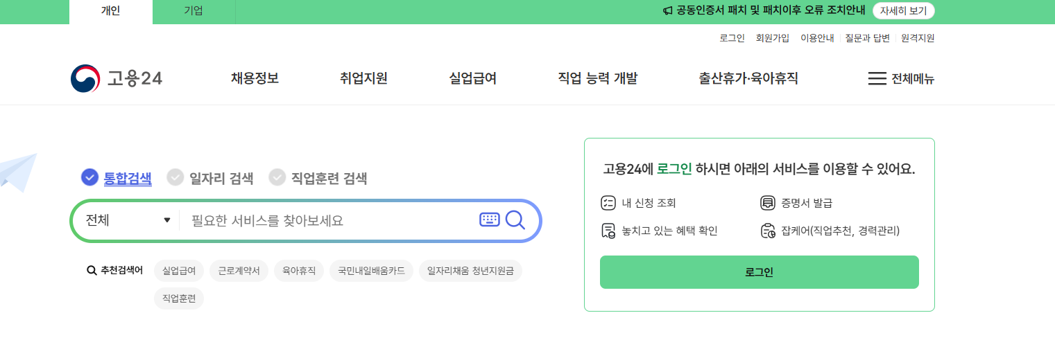 - 개인(근로자): 공동인증서, 간편 인증, 간편비밀번호